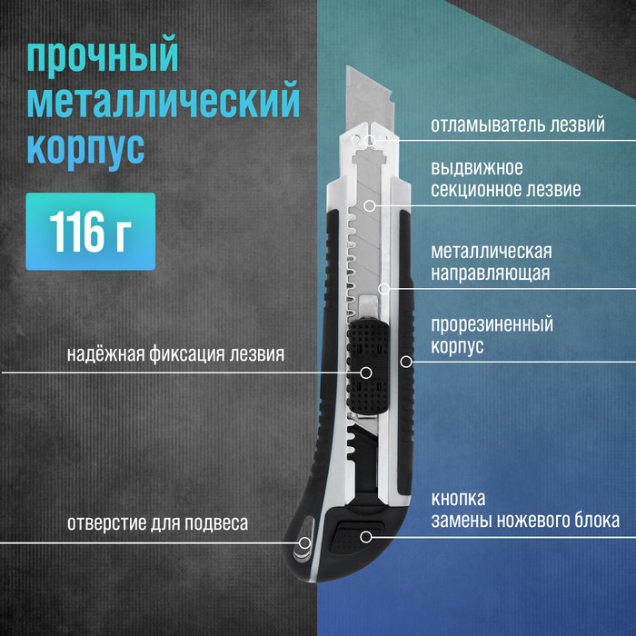 Нож универсальный ТУНДРА, металлическая направляющая, 2К корпус, 18 мм