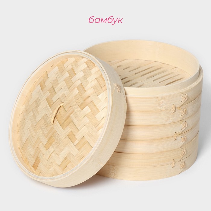 Конструкция из бамбуковых ёмкостей предназначена для приготовления пищи на пару. Резервуаром для воды в данном случае выступает кастрюля или сковорода WOK (в комплект не входит). Обработка паром сохраняет полезные свойства продуктов, делает блюда сочными и нежными. Изделие подходит для приготовления овощей, риса, рыбы и мяса, пельменей, мантов и хинкалей.