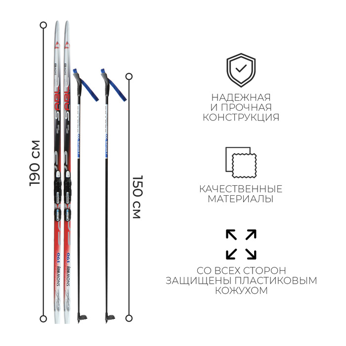 Комплект лыжный: пластиковые лыжи 190 см с насечкой, стеклопластиковые палки 150 см, крепления NNN, цвета МИКС