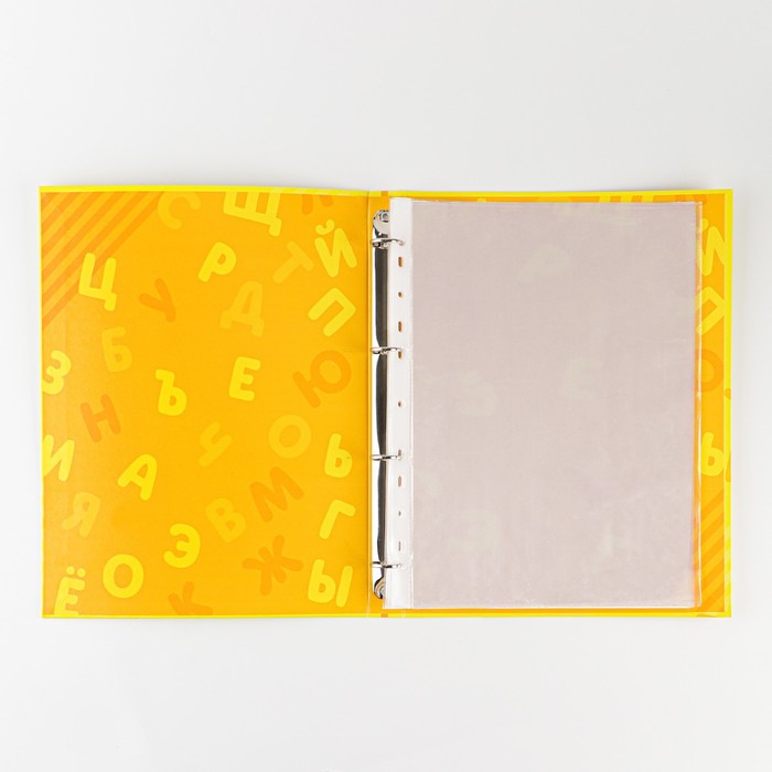 В набор входит: папка на кольцах и 14 вкладышей. Обложка выполнена из переплетного картона плотностью 1,5 мм, внутри есть четыре кольца, на которые следует цеплять файлы.