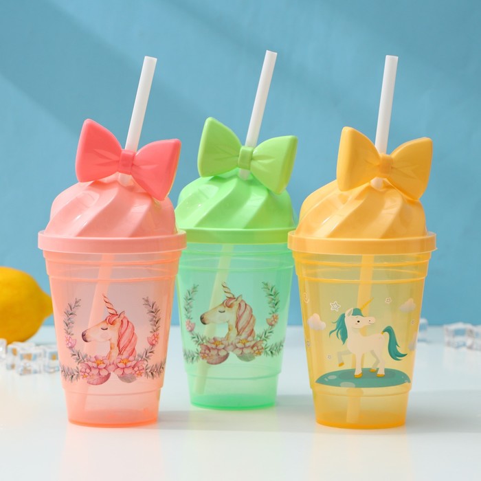 Стакан с трубочкой и крышкой «Единорог», 400 мл, цвет МИКС