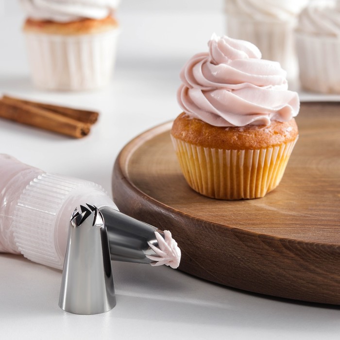 Насадка предназначена для нанесения на десерты необычных украшений из крема. Пользоваться изделием просто: достаточно присоединить его к универсальному кондитерскому мешку.