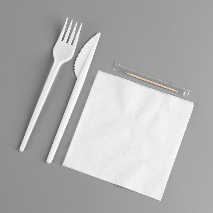 Набор пластиковых одноразовых столовых приборов 5 в 1: вилка, ложка, нож, салфетка, зубочистка, цвет белый