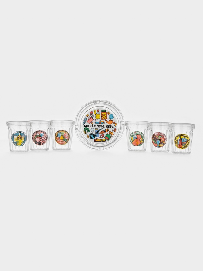 Набор состоит из шести стопок и пепельницы. Изделия изготовлены из качественного и прочного стекла.