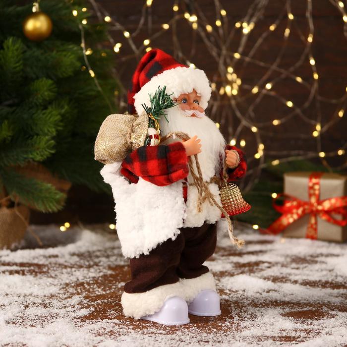 Дед Мороз "В клетчатом тулупе, с колокольчиком" двигается, ботинки светятся, 13х28 см