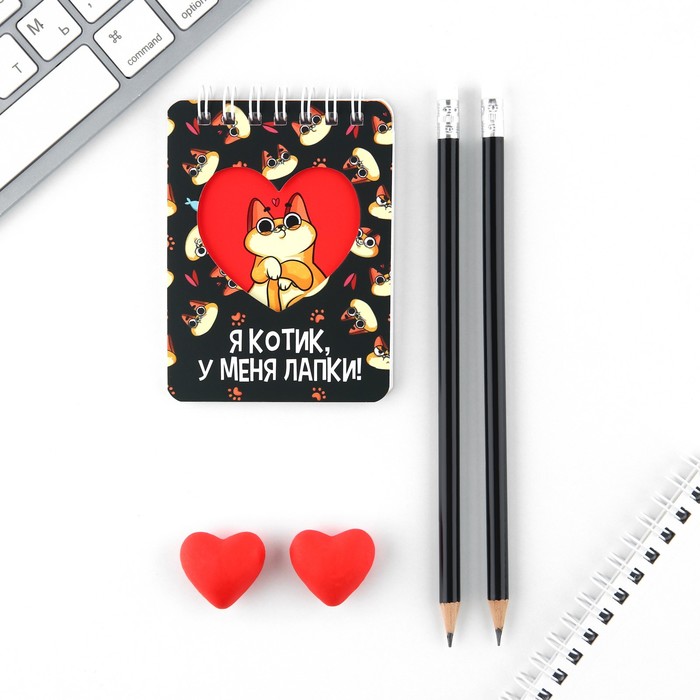 Канцелярский набор «Котик», карандаши 2 шт, ластики 2 шт, блокнот
