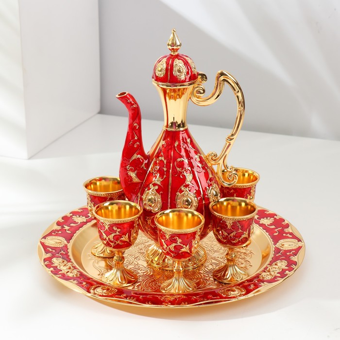 Набор винный кувшин, 6 бокалов и поднос "Турция. Цветы и узоры" красный с золотом