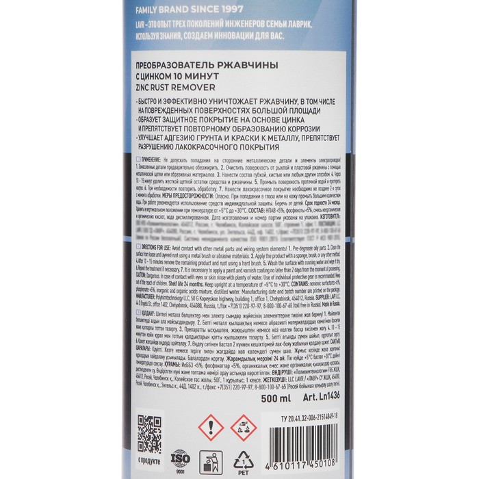 Преобразователь ржавчины LAVR с цинком, 500 мл, триггер, Ln1436