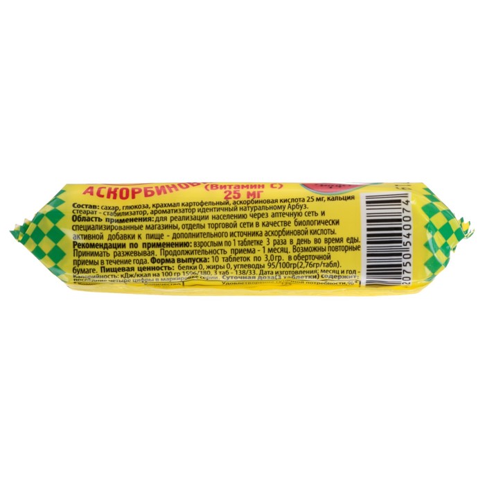 Аскорбиновая кислота с сахаром, арбуз, 10 шт по 3 г за 50.00 ₽ Купить оптом и в розницу на tijorat.com | Быстрая доставка | скидки