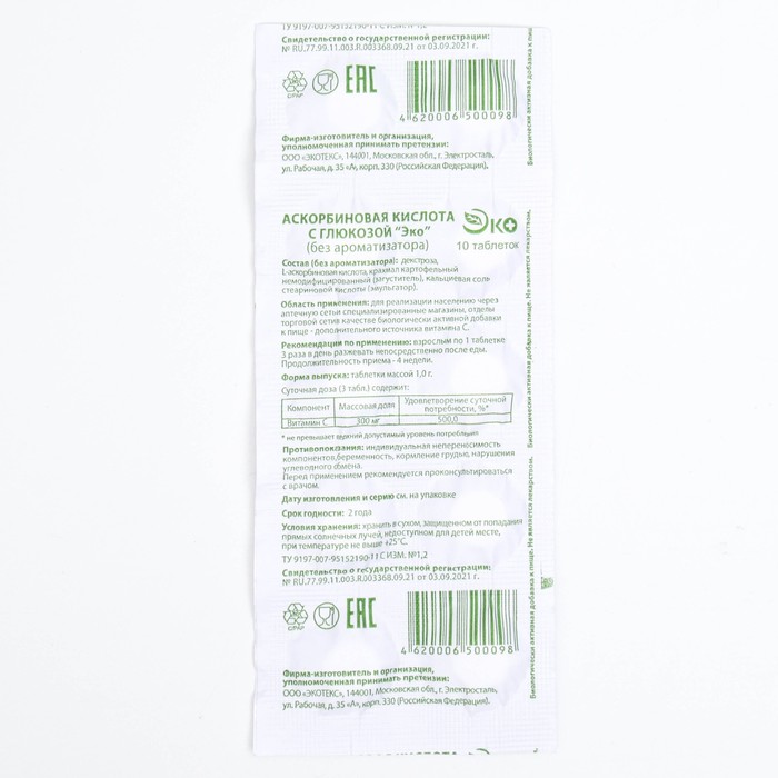 Аскорбиновая кислота со вкусом клюквы Экотекс, 10 таблеток по 2,9 г