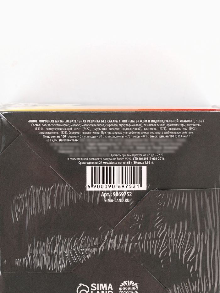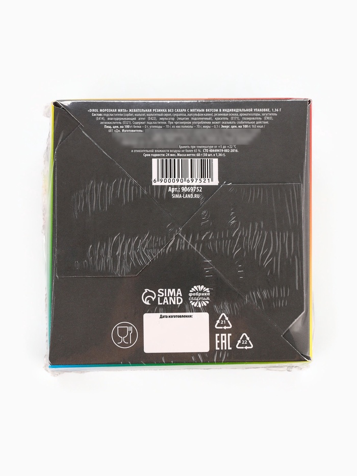 Состав: подсластители (сорбит, мальтит, мальтитный сироп, сукралоза, ацесульфам калия), резиновая основа, ароматизаторы, загуститель (Е414), влагоудерживающий агент (Е422), эмульгаторы (лецитин подсолнечный), краситель (Е171), глазирователь (Е903), антиокислитель (Е321).