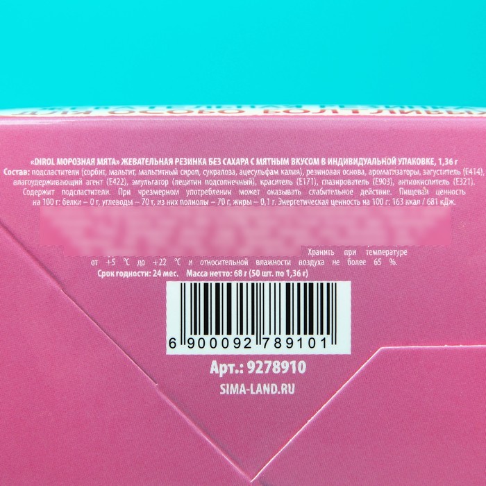 Состав: подсластители (сорбит, мальтит, мальтитный сироп, сукралоза, ацесульфам калия), резиновая основа, ароматизаторы, загуститель (Е414), влагоудерживающий агент (Е422), эмульгатор (лецитин подсолнечный), краситель (Е171), глазирователь (Е903), антиокислитель (Е321). Содержит подсластители. При чрезмерном употреблении может оказывать слабительное действие.