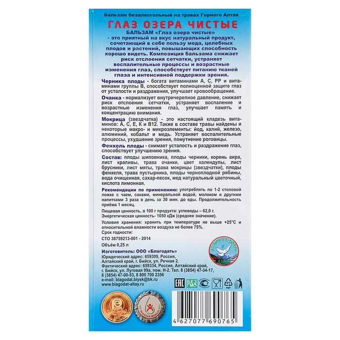 Бальзам безалкогольный "Глаз озера чистые" для зрения, 250 мл