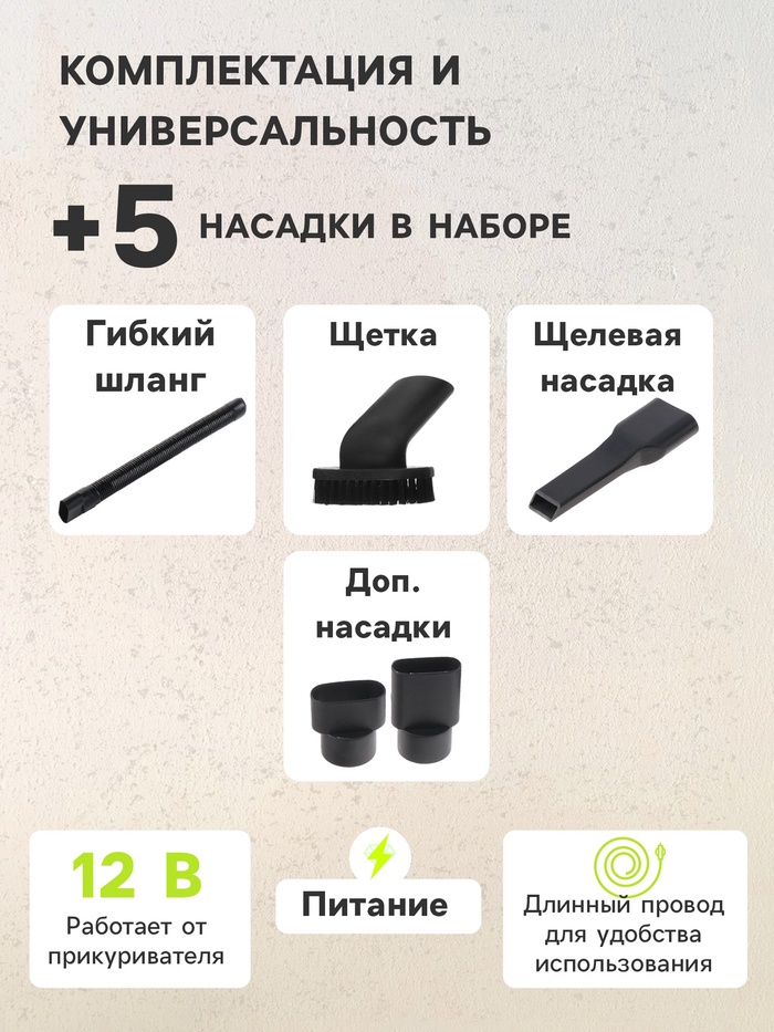 Пылесос автомобильный CYCLONE TURBO 125 Вт, 12 В, 5 насадок, микс