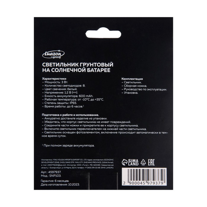 Изделие быстро и легко устанавливается в грунт с помощью штыря и не требуют подключения к электрической сети. Полного заряда аккумулятора хватает для работы фонаря в течение 6 часов.