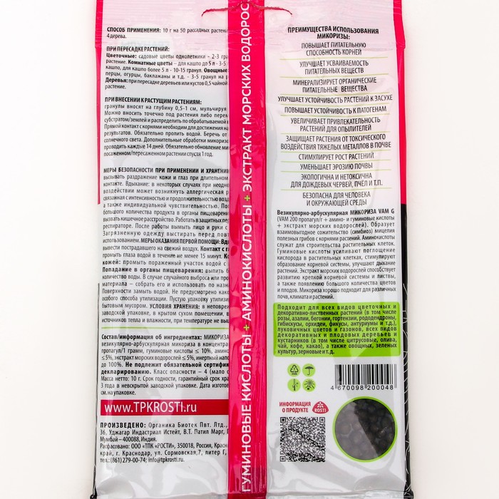 <p style="text-align: start"><span style="font-size: 14px">Микориза улучшает приживаемость цветов и растений, улучшает снабжение растения питательными веществами и водой, усиливает корнеобразование.</span> <p style="text-align: start"><span style="font-size: 14px">Микориза, симбиоз корней растения и почвенных грибов.</span> <p style="text-align: start"><span style="font-size: 14px">Гриб поставляет растению из почвы питательные вещества (фосфаты, нитраты) и улучшает снабжение растения влагой.</span> <p style="text-align: start"><span style="font-size: 14px">От растения гриб получает жизненно важные углеводы.</span> <p style="text-align: start"><span style="font-size: 14px">Благодаря такому сотрудничеству растения оживают, лучше цветут, у них вырабатывается устойчивость к болезням и неблагоприятным погодным условиям, улучшается структура почвы.</span> <p style="text-align: start"><span style="font-size: 14px">Микориза обладает мощным противомикробным и противогрибковым свойством – подавляет корневые и плодовые гнили, семенные инфекции, макроспориоз, фузариоз, фитофтороз, паршу и другие болезни растений.</span> <p style="text-align: start"><span style="font-size: 14px">Повышается процент выживаемости и сопротивляемость паразитам, грибкам и нематодам.Состав: микроорганизмы, пищевые ферменты, питательная основа.</span> <p style="text-align: start"><br>