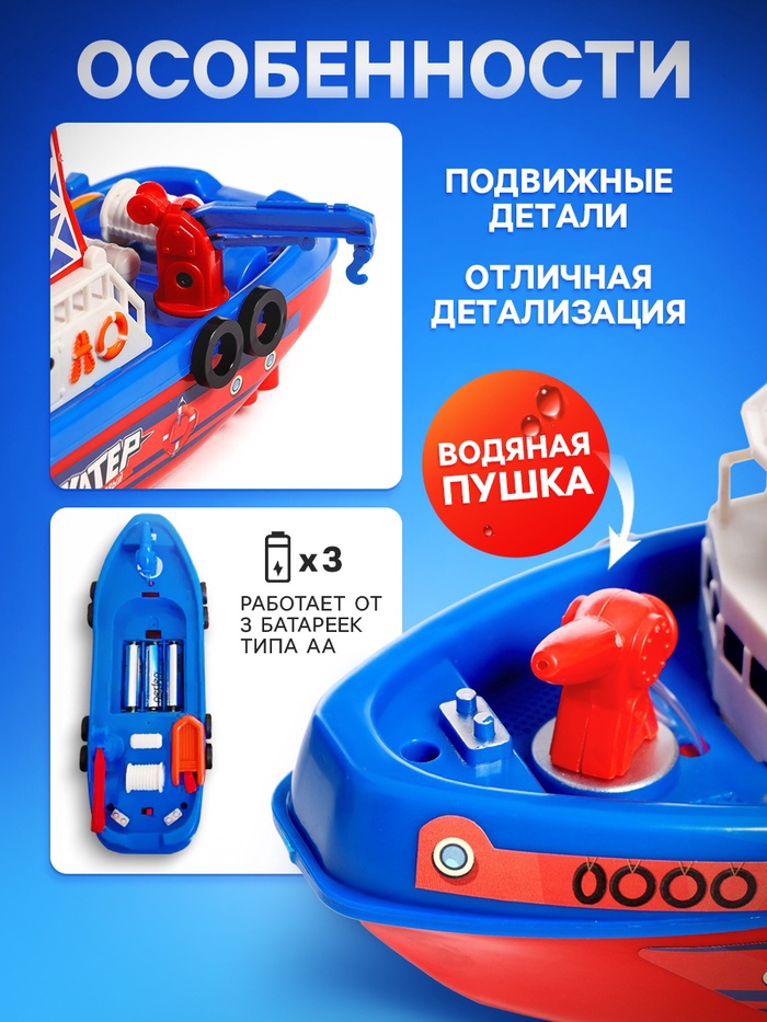 <h2 class="h4">Преимущества</h2>Корабль отлично держится на плаву. Установите в него 3 батарейки типа АА (в комплект не входят) и запустите в ванной или на небольшом водоёме.