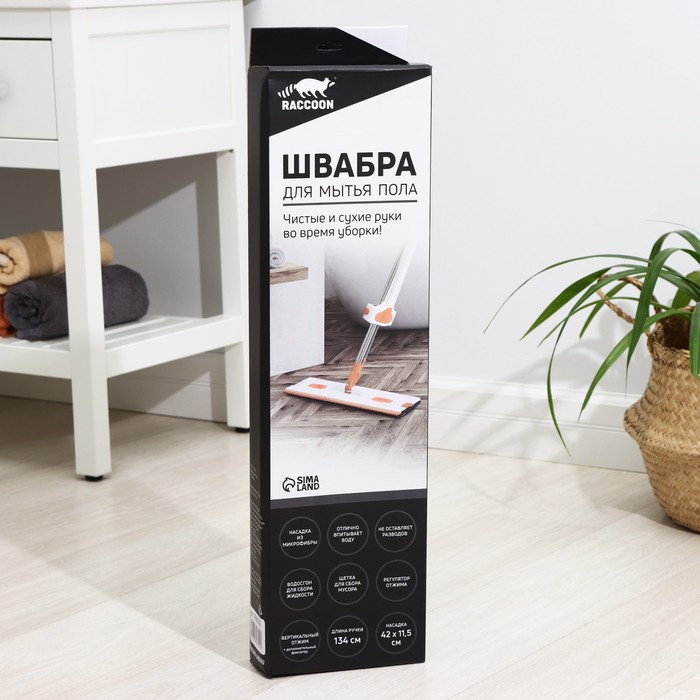 Швабра с отжимом, водосгоном и щёткой Raccoon, 2 насадки из микрофибры 42×11,5 см, стальная ручка 134 см