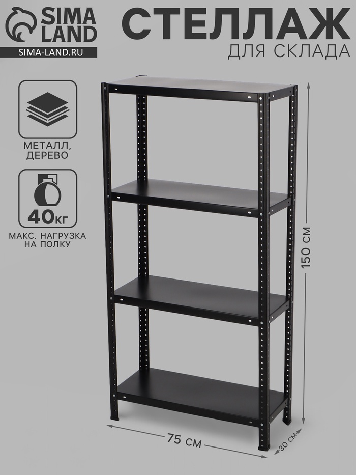 Стеллаж металлический для склада, 4 полки, дерево, 150×75×30 см, чёрный