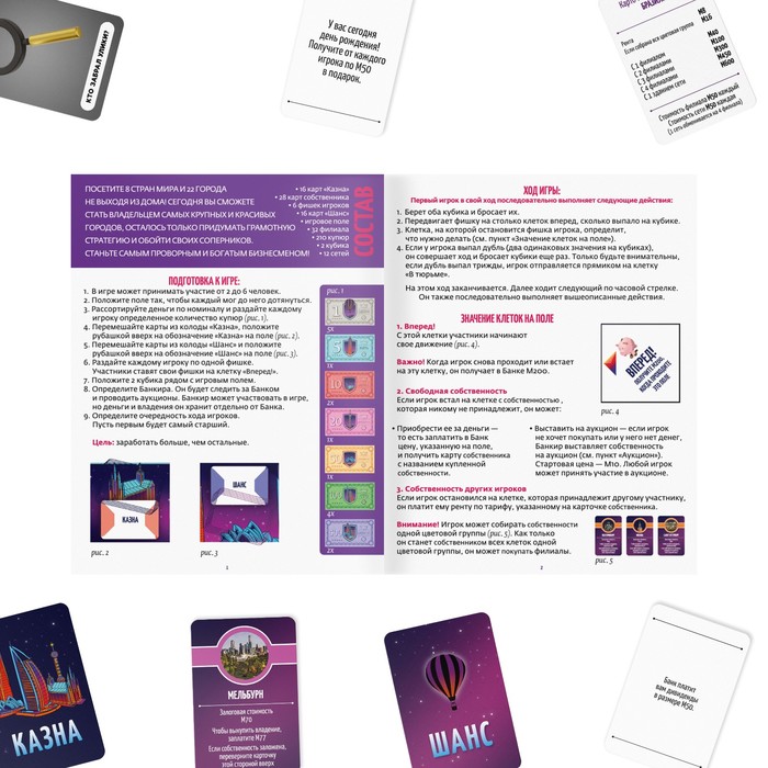 Сегодня у вас есть уникальная возможность посетить 8 стран мира и 22 города. И всё это не выходя из дома! Вы сможете стать владельцем самых крупных и красивых городов, осталось только придумать грамотную стратегию и обойти соперников. Станьте самым проворным и богатым бизнесменом. Бонус! Интересные факты о достопримечательностях разных городов мира.