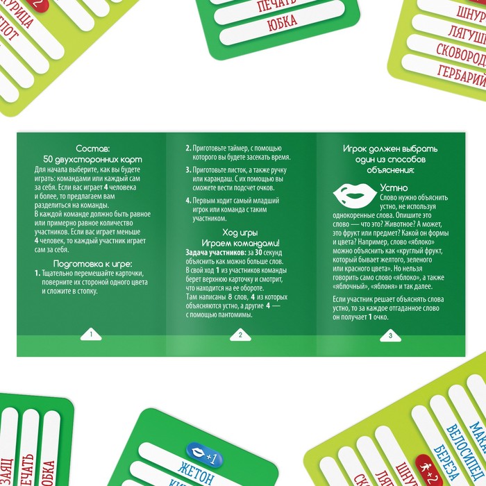 <h2 class="h4">Что значит пантомимой?</h2>Проявите свои артистические способности — объясняйте с помощью мимики и жестов! Это значит, что нельзя произносить слова и звуки, а также чертить в воздухе очертания букв, цифр и указывать на предметы, о которых идёт речь в карточке. Если игрок объясняет пантомимой, то за каждое отгаданное слово он получает по 2 очка.