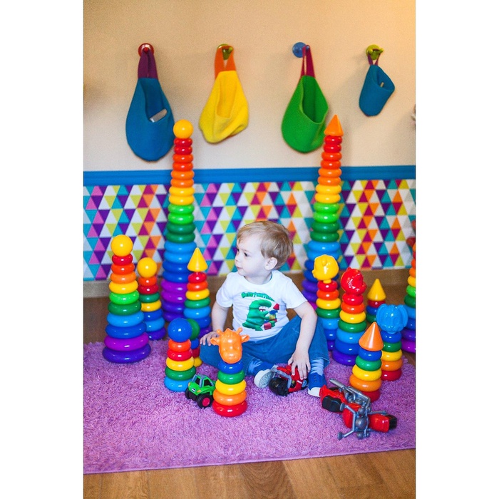 Каждое кольцо разного цвета и пронумеровано. Собирая пирамидку, ребёнок освоит основные цвета радуги и получит базовые навыки счёта. Игры с красочной пирамидкой разовьют у крохи мелкую моторику, координацию движений, воображение, логическое и образное мышление, навыки конструирования. Он научится различать предметы по величине, сравнивать их и делать выводы. Также юный конструктор познакомится с такими понятиями, как «больше», «меньше», «круг», «конус», «плоский», «объёмный».