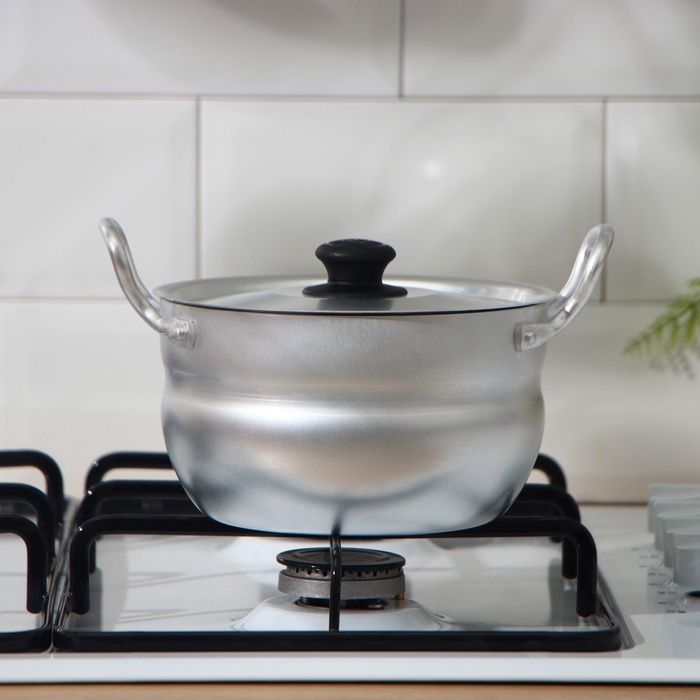 Кастрюля с металлической крышкой и двумя металлическими ручками на 1,7 литров изготовлена из чистого пищевого алюминия методом штамповки. Основные характеристики такой посуды: легкость, прочность, быстрый нагрев, безопасность и доступность. Кастрюля подходит к использованию на электрической, керамической, газовой плите, легко моется и имеет неограниченный срок службы.
