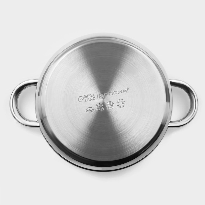Кастрюля с крышкой из нержавеющей стали Доляна «Классика», 3 л, d=20 см имеет качественное трёхслойное капсулированное дно толщиной 1,1 мм (0,3 мм сталь/ 0,5 мм алюминий/ 0,3 мм сталь) и высокие стенки (толщина 0,3 мм). Они обеспечивают оптимальное распределение тепла по всей поверхности кастрюли, что препятствует пригоранию еды в процессе готовки. Используйте минимум масла и жира, сохраняйте максимальное количество полезных веществ и натуральный вкус продуктов.