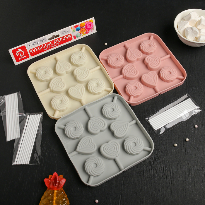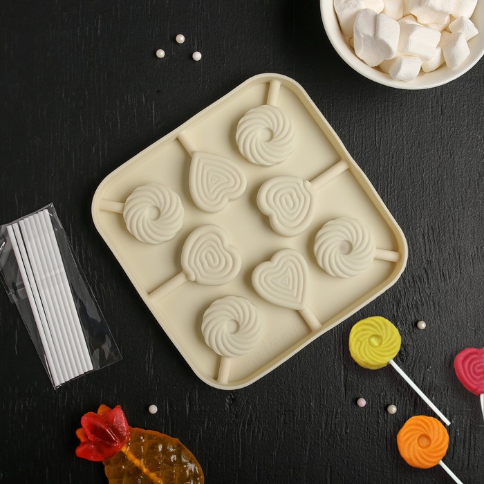 Форма силиконовая для леденцов Доляна «Свидание», 14,5×14,5×1,5 см, 8 ячеек, с палочками, цвет МИКС