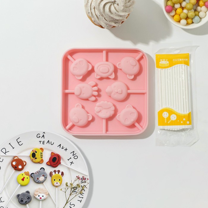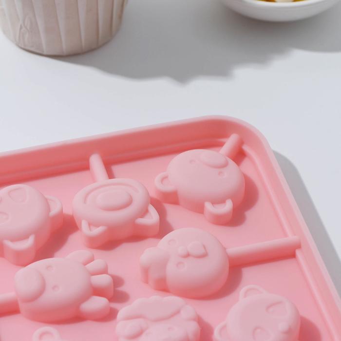 Форма силиконовая для леденцов «Зверята», 14×14×1,4 см, 8 ячеек, с палочками, цвет МИКС
