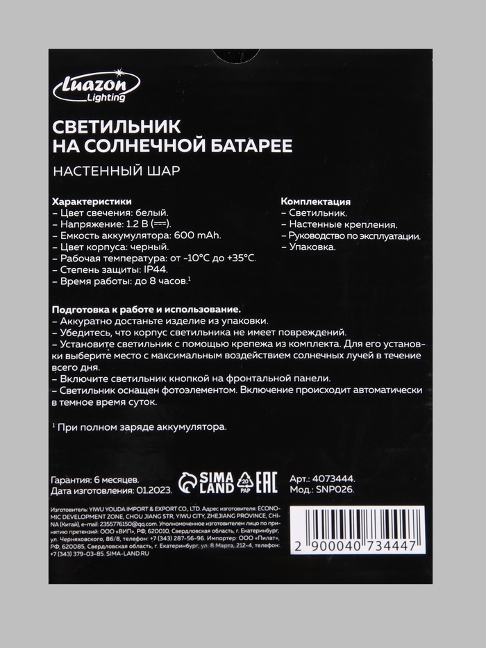<p align="justify">Luazon Lighting - сертифицированная продукция, экологична и безопасна, полностью соответствующая требованиям Технических Регламентов Таможенного Союза. Разработчики, инженеры, дизайнеры, технологи и производственники Luazon Lighting работают над тем, чтобы продукция торговой марки приносила свет, праздничное настроение, уют и тепло в каждый город и в каждый дом нашей необъятной родины!<p align="justify">Фонарь на солнечной батарее - непременный атрибут современного участка. В нашем интернет-магазине вы найдёте фонари на солнечной батарее, которые придадут саду поистине сказочную атмосферу. Используя электроэнергию, полученную от солнца, садовые фонари автоматически начинают освещать всё вокруг с наступлением темноты. При помощи этих аксессуаров можно подсветить дорожки, маленький пруд возле дома и другие объекты. Помимо эстетической стороны, использование такого освещения подразумевает и практическое значение: теперь вы точно не оступитесь на тёмных тропинках.