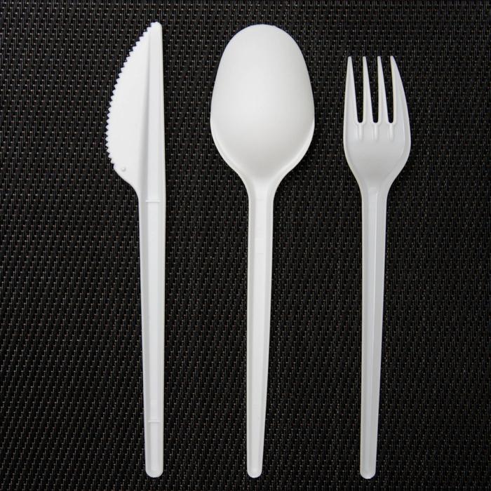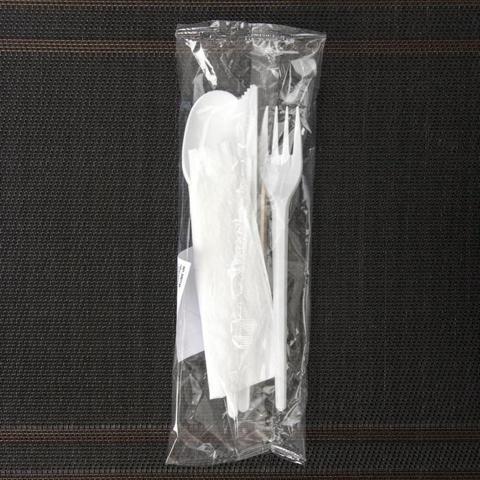 Набор пластиковых одноразовых столовых приборов 5 в 1: вилка, ложка, нож, салфетка, зубочистка, цвет белый