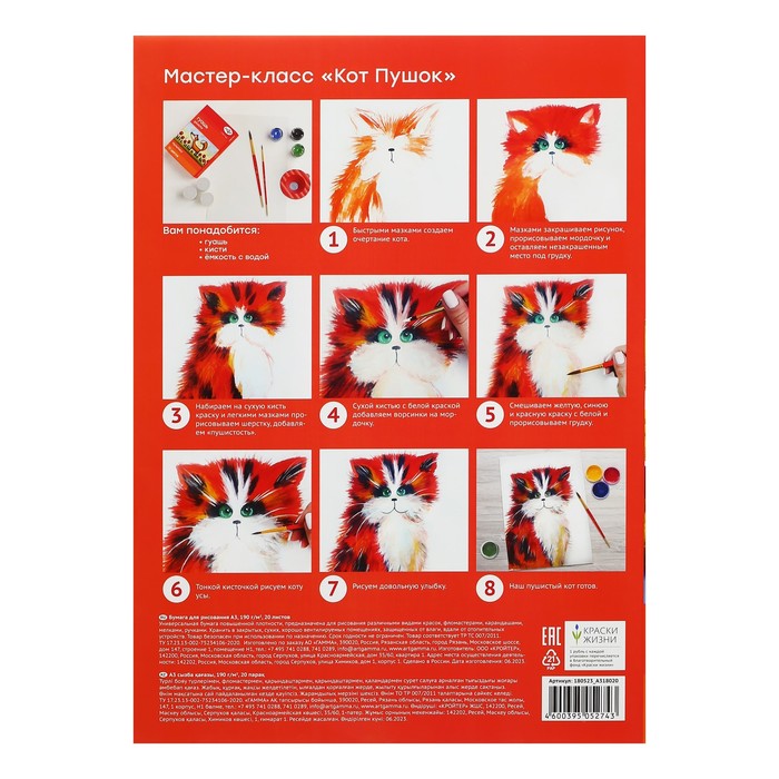 Бумага благодаря тому, что изготовлена из 100% целлюлозы полностью безопасна для детей. Для первых шагов в искусстве малышу в подарок на обратной стороне папки мастер-класс по рисованию.