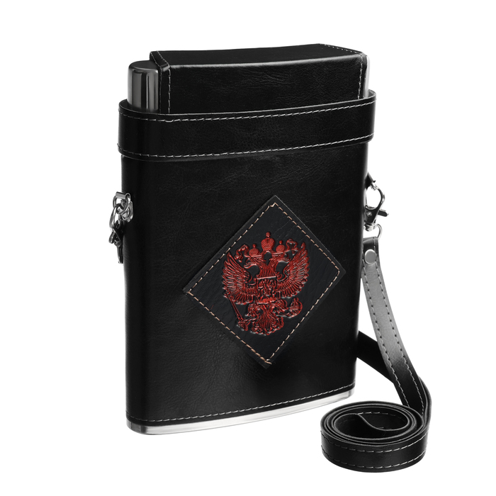 Фляжка, 540 мл "Герб России", 3 стопки, на ремне, 13 х 3.5 х 18.5 см, черная