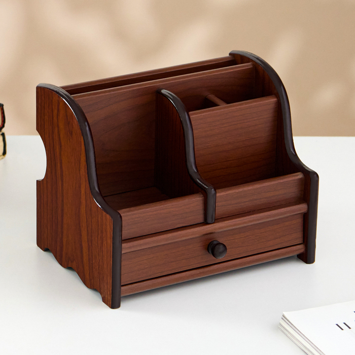 Компактный настольный набор поможет избежать хаоса на рабочем месте. Храните в нём канцелярские принадлежности или другие мелочи, чтобы правильно организовать пространство. К тому же изделие имеет минималистичный дизайн и выполнено под дерево, поэтому оно украсит собой любое место как декоративный элемент.
