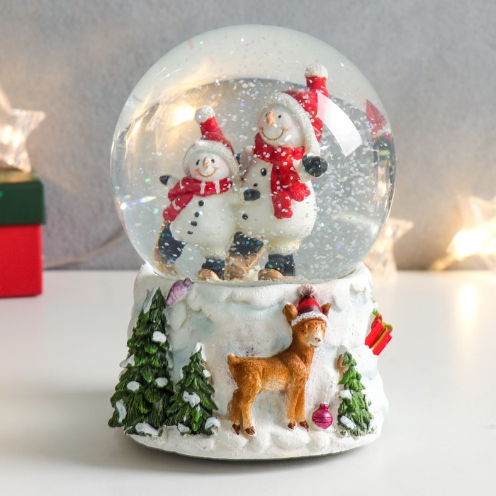 Сувенир полистоун водяной шар музыка "Два снеговичка и оленёнок" 11х10х14 см