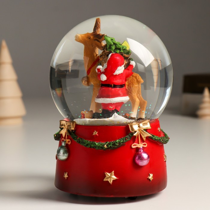 Сувенир полистоун водяной шар музыка механ. "Дед Мороз и северный олень" 11,5х11,5х14 см