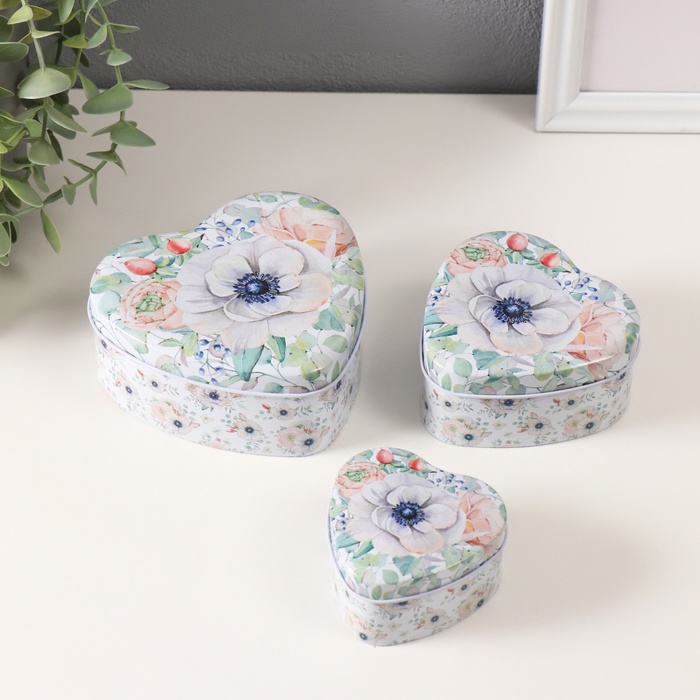 Шкатулка металл сердце "Нежность цветов" набор 3 шт 10,5х12,6х5 см