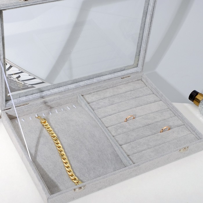 Подставка для украшений "Шкатулка" 10 крючков и 8 полос, 35x24x5, стеклянная крышка, цвет серый