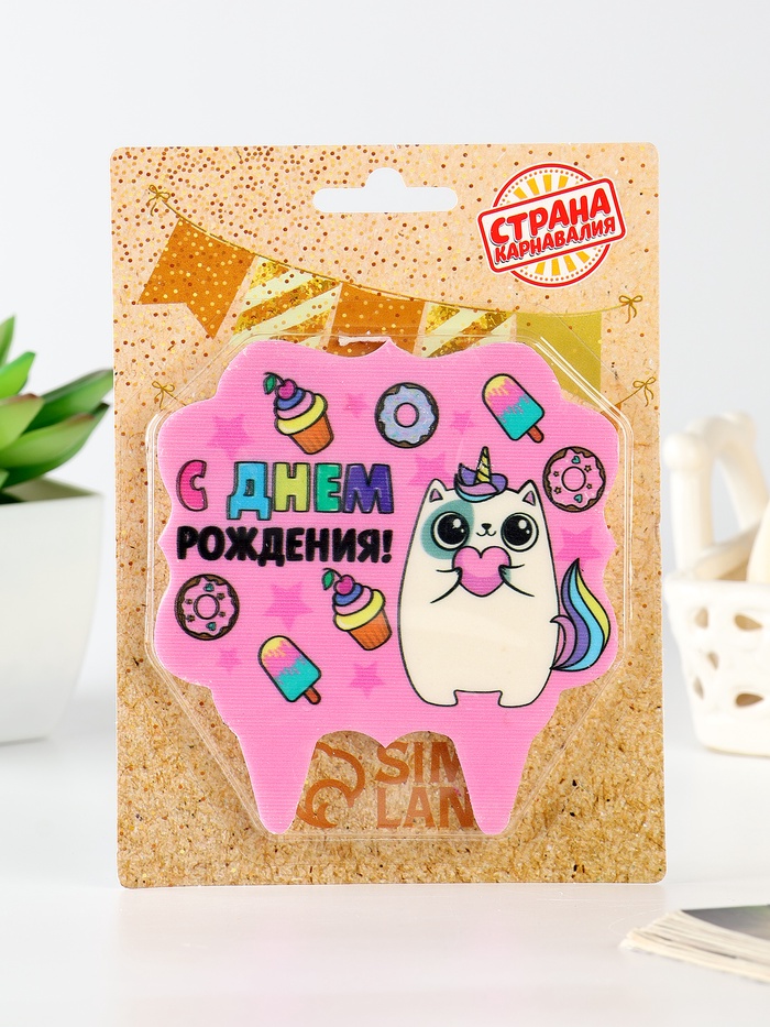 Свеча для торта «С Днём Рождения, котёнок единорожка», 8 см