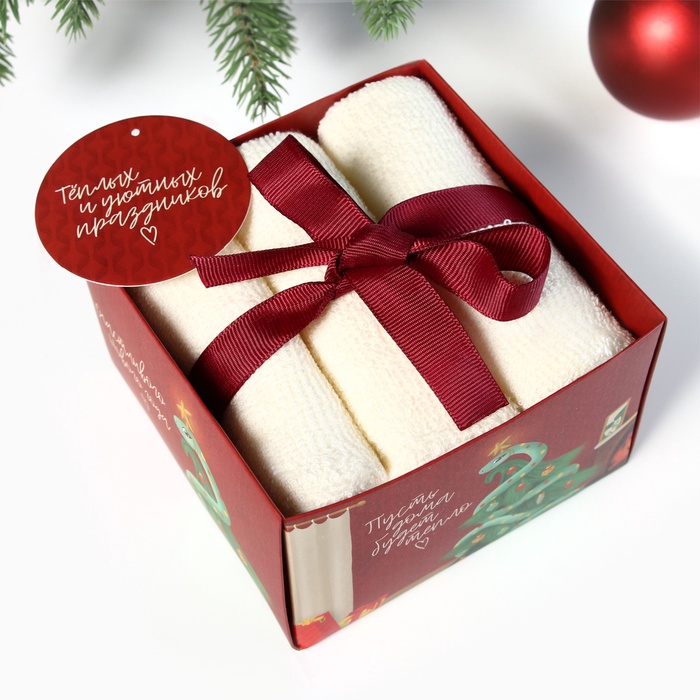 Новый год. Символ года. Змея. Набор махровых полотенец "Змея на ёлке" 30х30 см - 3 шт, хлопок 340гр/м2