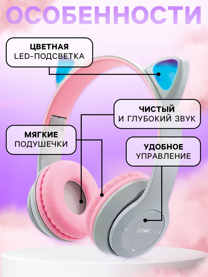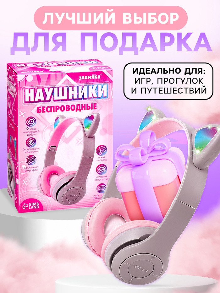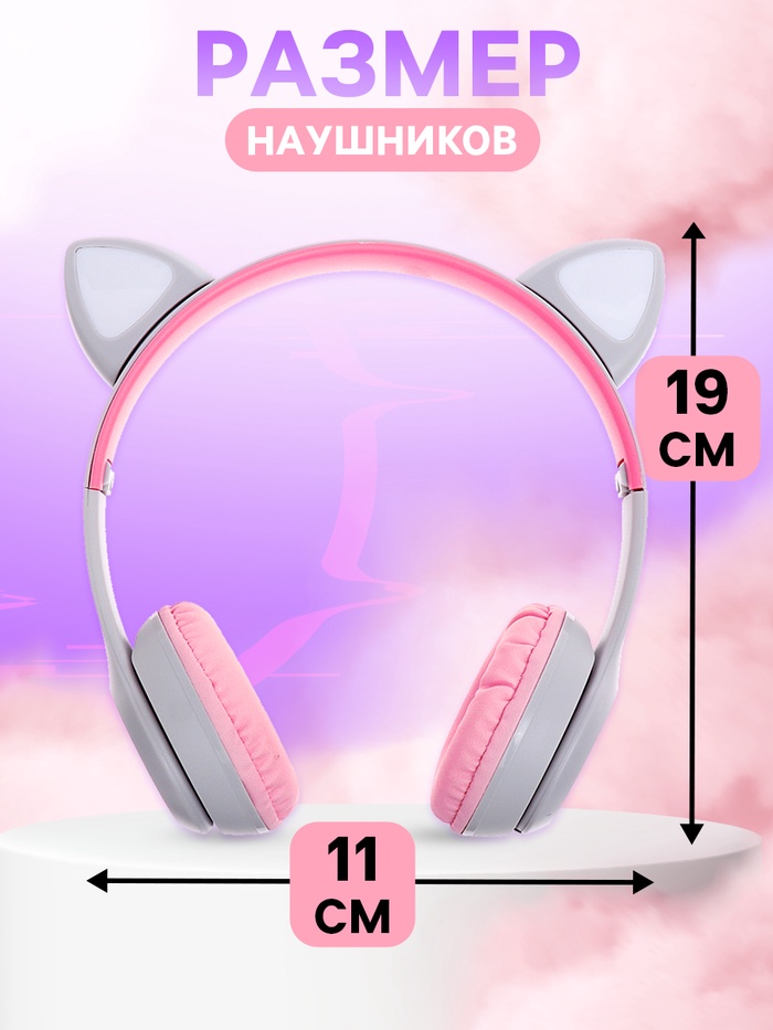 Наушники беспроводные «Котик», звуковые и световые эффекты, складные, цвет серый