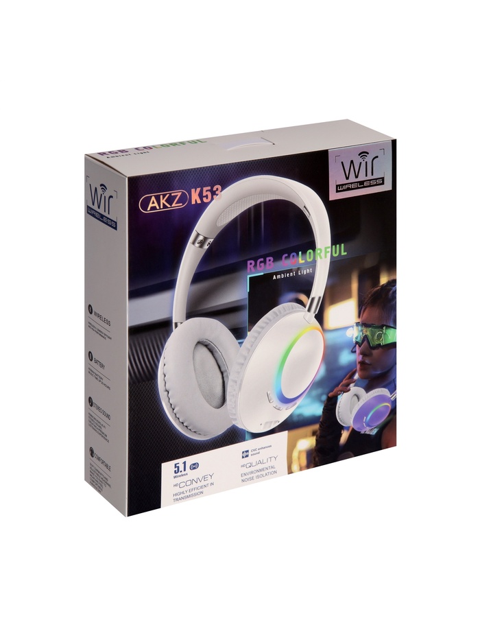 Наушники AKZ K53, беспроводные, полноразмерные, микрофон, подсветка RGB, белые