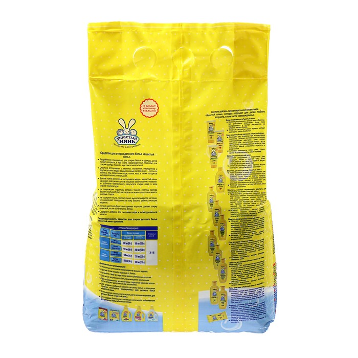 Стиральный порошок «Ушастый нянь» специально разработан для чистки белья и одежды детей любого возраста, в том числе и новорождённых.