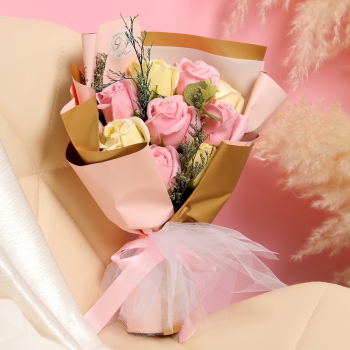 Премиальный букет из розово-желтых мыльных роз, 9 шт