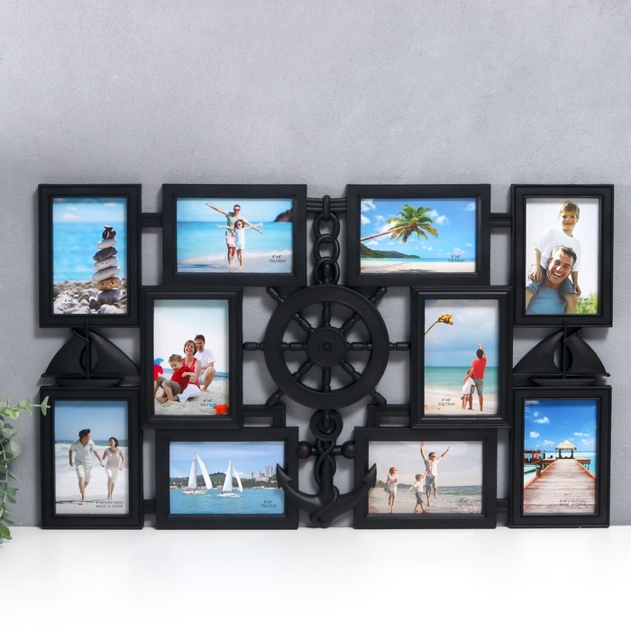 Фоторамка пластик на 10 фото 10х15 см "Якорь и штурвал" чёрная 41х68 см