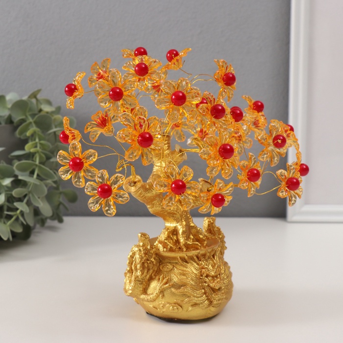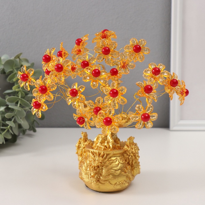 Сувенир бонсай "Цветочное денежное дерево в мешке с драконами" 35 цветов 18х18х7,5 см