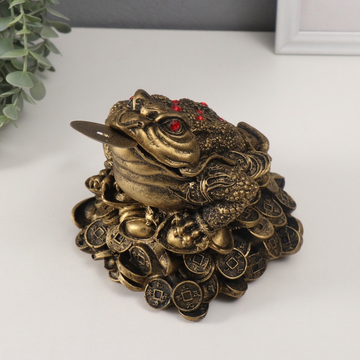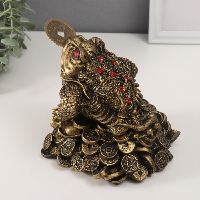 Нэцке полистоун бронза "Денежная жаба с монетой на горе монет" 16,2х19х16,5 см