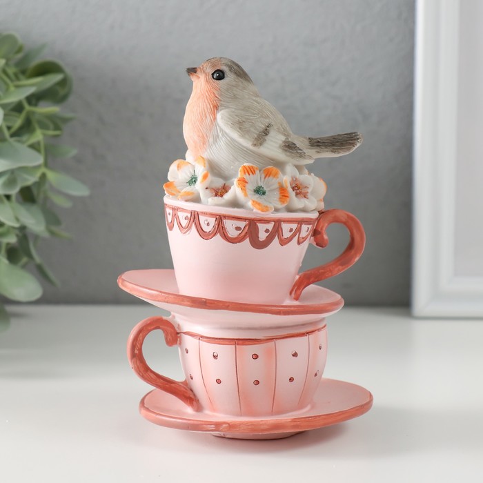 Сувенир полистоун "Снегирь сидит на чашечках, с цветами" 9х9х14 см