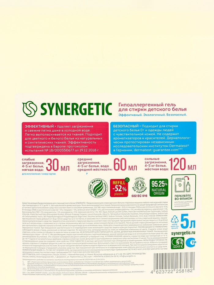 Жидкое средство для стирки Synergetic, гель, для детского белья, 5 л